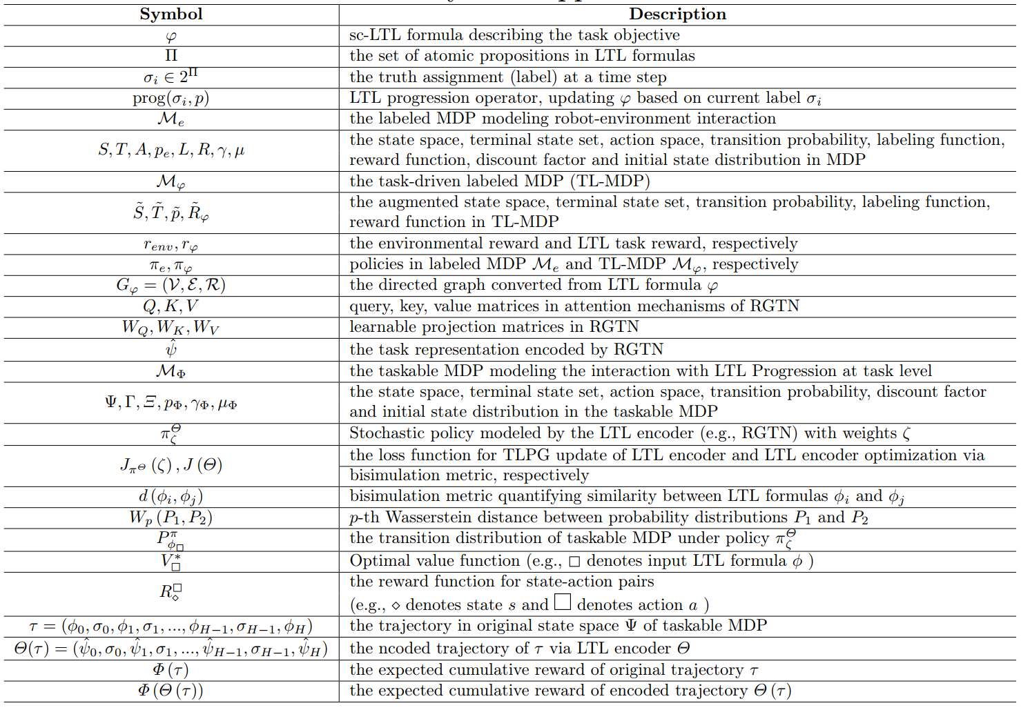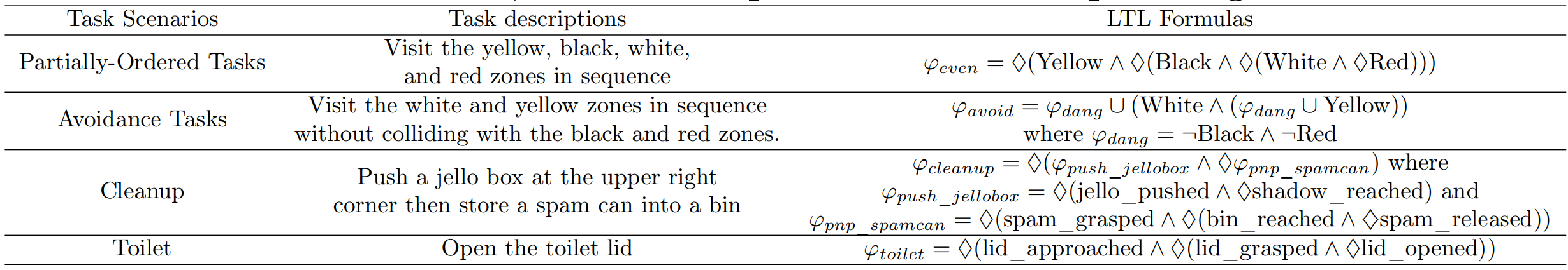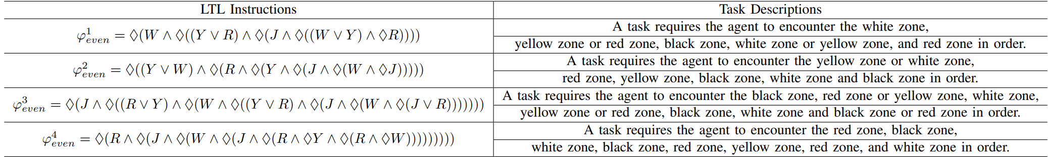 In ZoneEnv and LetterWorld scenarios, we sample different LTL tasks from the same multi-task distribution in every episode. For example, the sampled task can be $\lozenge(\mathrm{Black}\wedge\lozenge(\mathrm{White}\wedge\lozenge\mathrm{Red}))$ when the agent perfoming "Eventually_1_3_1_2", where "Eventually" means the task kind, "1_3" means the interval of subgoal depth can be sampled, and "1_2" is the interval of task conjuncts can be sampled.